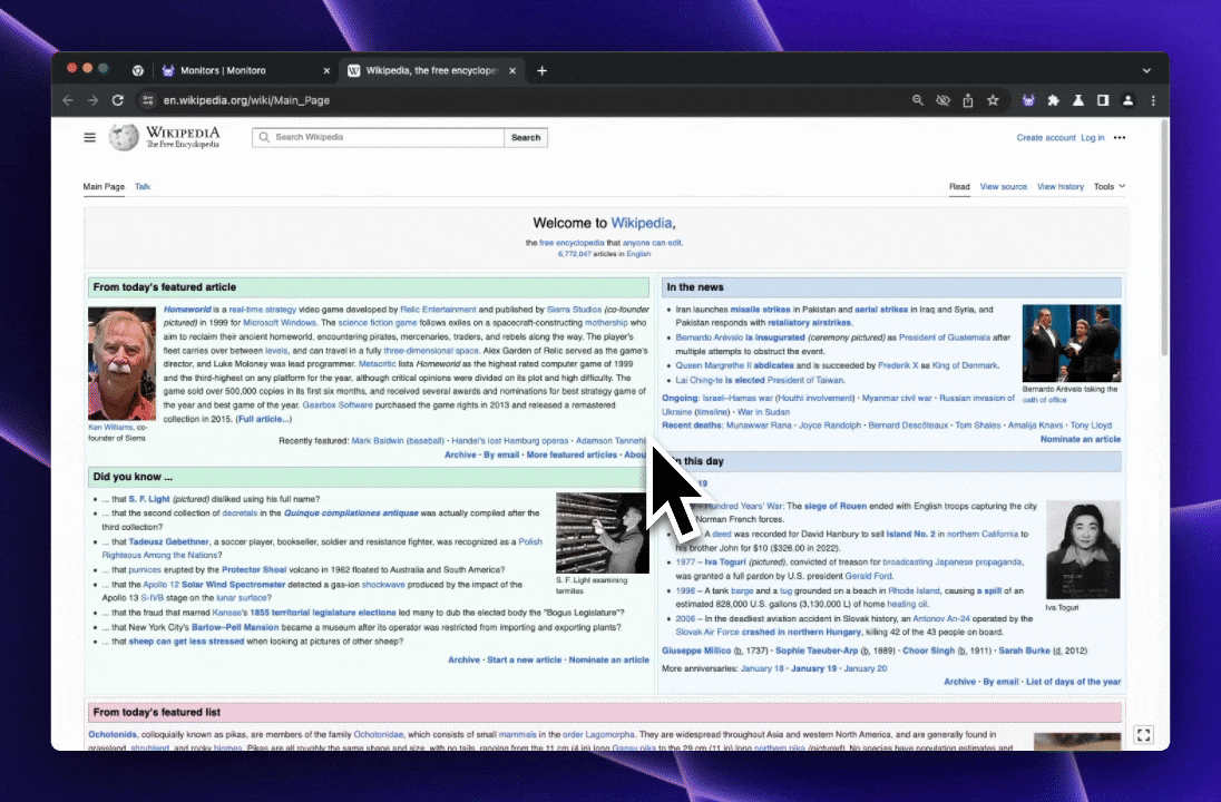 Monitors in monitoro are watching websites and webpages for changes around the clock, sending you alerts and running your automations. For example, a monitor can track a product page and send you an alert every time the price changes.&#x20;